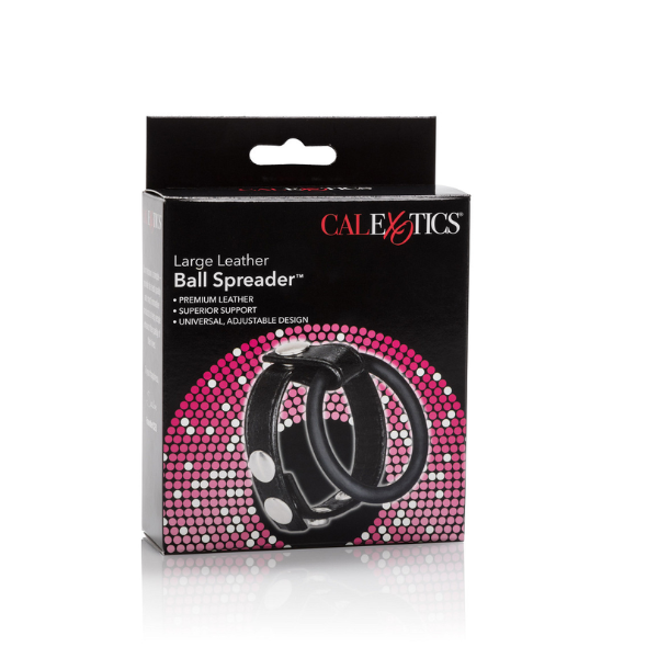 Extend your seduction and ecstasy pleasure, with the adjustable CalExotics Large Leather Ball Spreader. The easy to use, comfort fit strap and ring combo erection enhancer fits over the erect penis for prolonged erotic performance and intensified sensual satisfaction. Slip on the large sized strap, and adjust the steel push snaps to secure the perfect orgasmic tension, for a super-size experience every time. The enhancer comprises of a soft genuine leather strap, with steel plated snaps, and a flexible, smooth rubber ring. The erection enhancer is perfect for spontaneous, sensual exploration and instant self-gratification play. The smooth leather strap is designed to fit around the base of the scrotum, and is fully adjustable for ultimate erection support and tingling tension. The rubber ring slides over the penis to maintain performance and stamina.