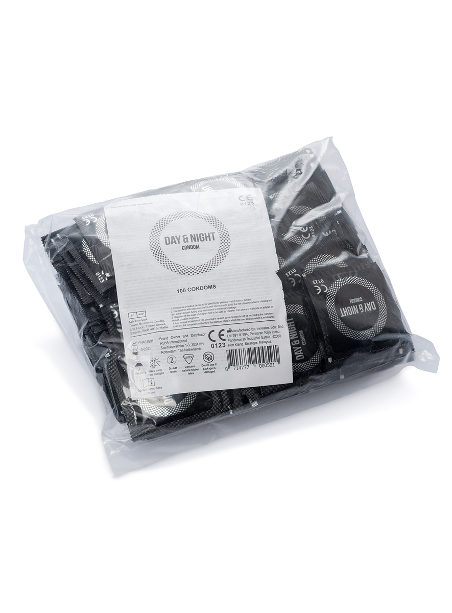 Condoms Day & Night XL 100pcs pack are professional condoms of the highest quality. The Condoms Day & Night XL 100pcs pack condoms are slightly larger than normal condoms and have no unpleasant latex smell. The reservoir is lubricated with a non-spermicidal silicone lubricant. The Day & Night condoms are supplied in units of 100 pieces. So you buy as little packaging as possible and what you need.