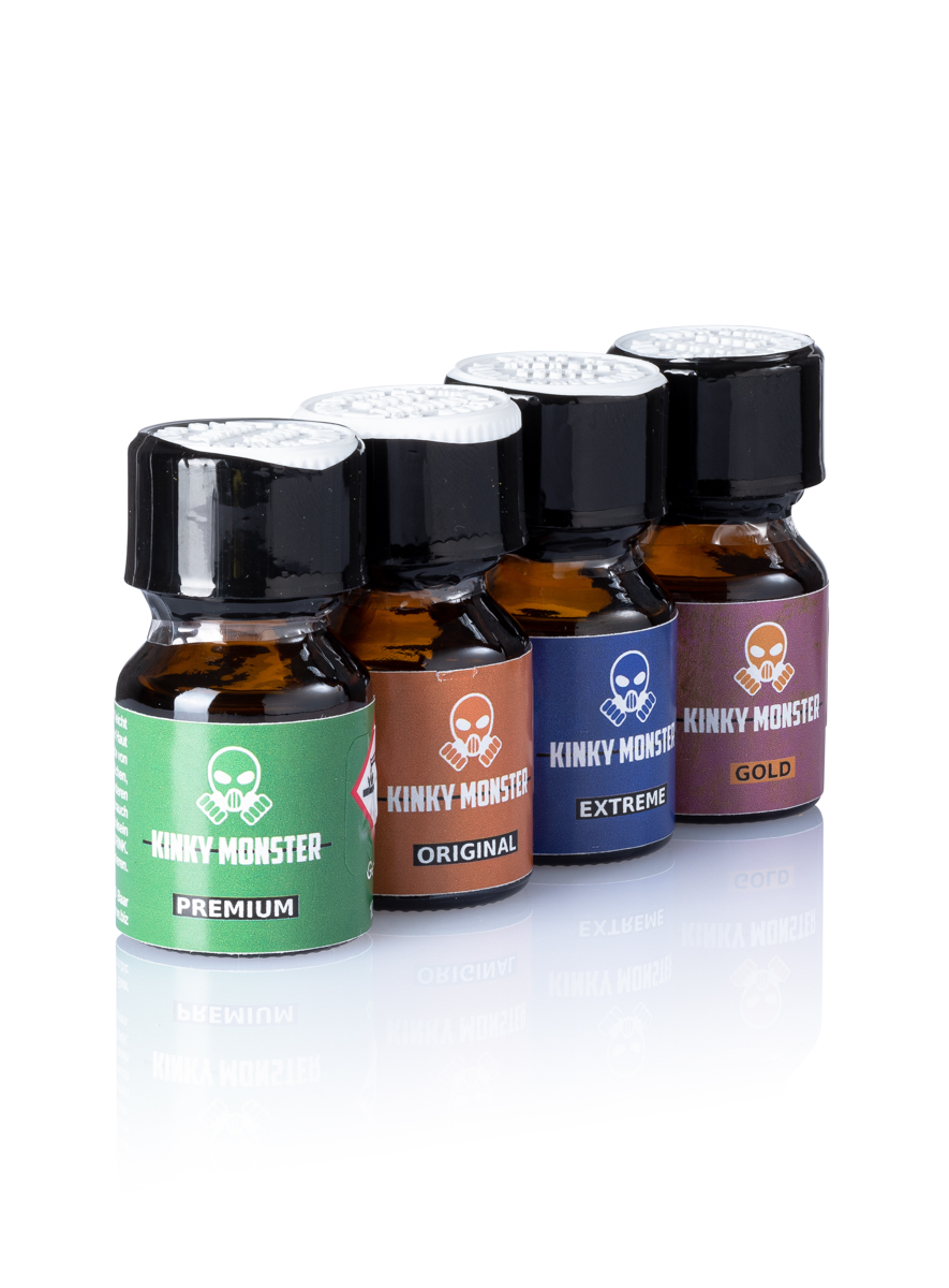 Kinky Monster Wild Collection is aimed at all kinksters and stands for even stronger and even longer lasting poppers. The Wild Collection includes one bottle each of Kinky Monster Premium Poppers 10ml, Kinky Monster Original Poppers 10ml, Kinky Monster Extreme Poppers 10ml and Kinky Monster Gold Poppers 10ml. For this purpose, the Kinky Monster Poppers bottles contain especially pure and high-percentage pentyl nitrite. Kinky Monster Poppers come in 8 different flavors. Learn more about Kinky Monster at www.kinky-monster.com.