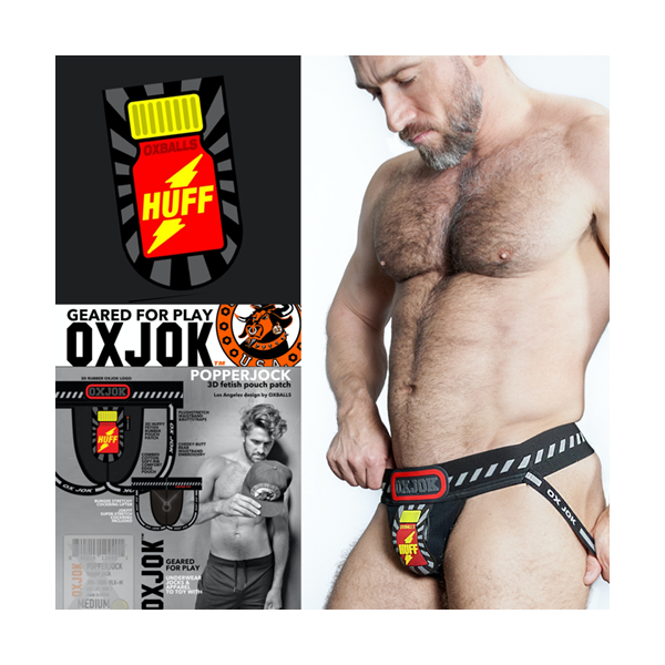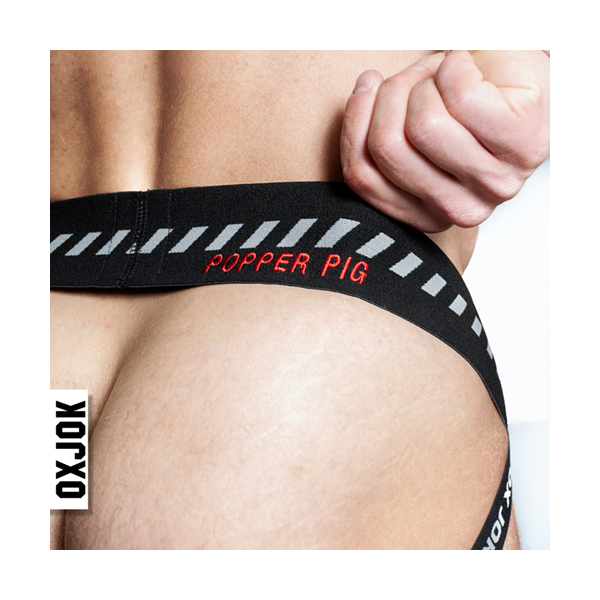 OXJOK POPPERJOCK 3D Rubber Huffer Jock Black is a must-have for anyone who wants to show off their kinks. The jockstrap features a huge Poppers Bottle 3D rubber patch on the front and a POPPERS-PIG embroidery on the right butt cheek – bold, cheeky, and unmistakable.